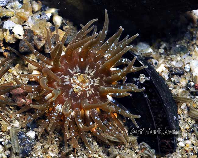 Millions of these small sea anemones form dense populations in the intertidal of Southern Chile mud flats and some other habitats. This is a photosynthetic species, it has numerous symbiotic zooxanthellae in its tissues.