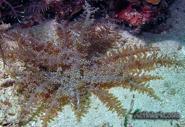 Megalactis is one of the three genera of tropical sea anemones belonging to the family Actinodendronidae which members also known as Hell’s fire anemones. They are very stingy. Two other genera are Actinodendron and Actinostephanus. Many internet images showing species of Megalactis are labelled as Actinodendron. Megalactis differs from Actinodendron by the position of the branches on its long tentacles. In Megalactis the branches are more or less clearly set along the sides of the tentacles, while in Actinodendron the branches are set all round the tentacles.